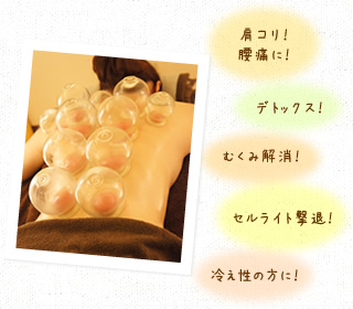 30個ほどの吸玉を用い、付けた状態で休んでいただいた後、吸玉を動かしてコリのひどいところをドレナージュし、血流やリンパの流れを改善させます。